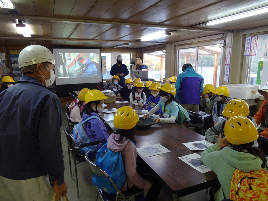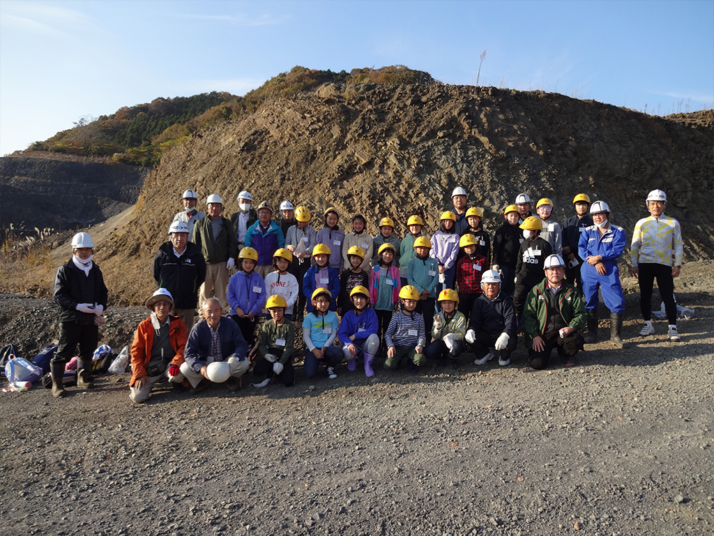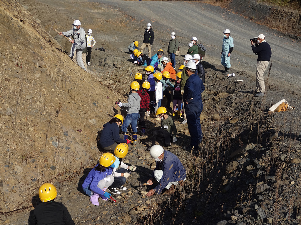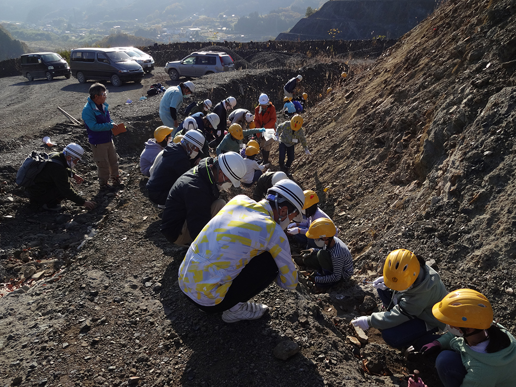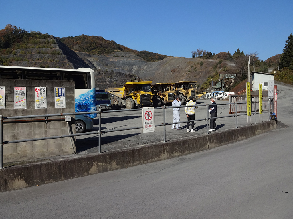 第3回講座は11月15日(日)に二階堂章信先生による「化石を発見しよう(II)」でした。バスで常陸大宮市家和楽の砕石工場に到着後、会議室で砕石の採取の仕方や砕石の役割について説明を受けたあと、化石について①化石ってなに?②化石はどんな岩から出てきたか?③示準化石とは?示相化石とは?④今日の採掘する木の葉の化石はおよそ何万年前のものか?⑤どのようにして化石になったのか?などの説明を受けた。その後、社員の方々の車に分乗して採掘現場まで送っていただき、採掘現場で危険防止の注意を受けた。採掘を始める前に地層の違いから年代が分かり、化石の出る地層(堆積岩)についての説明があった。