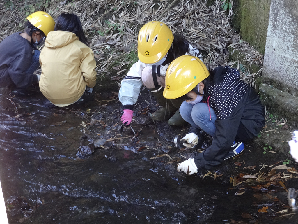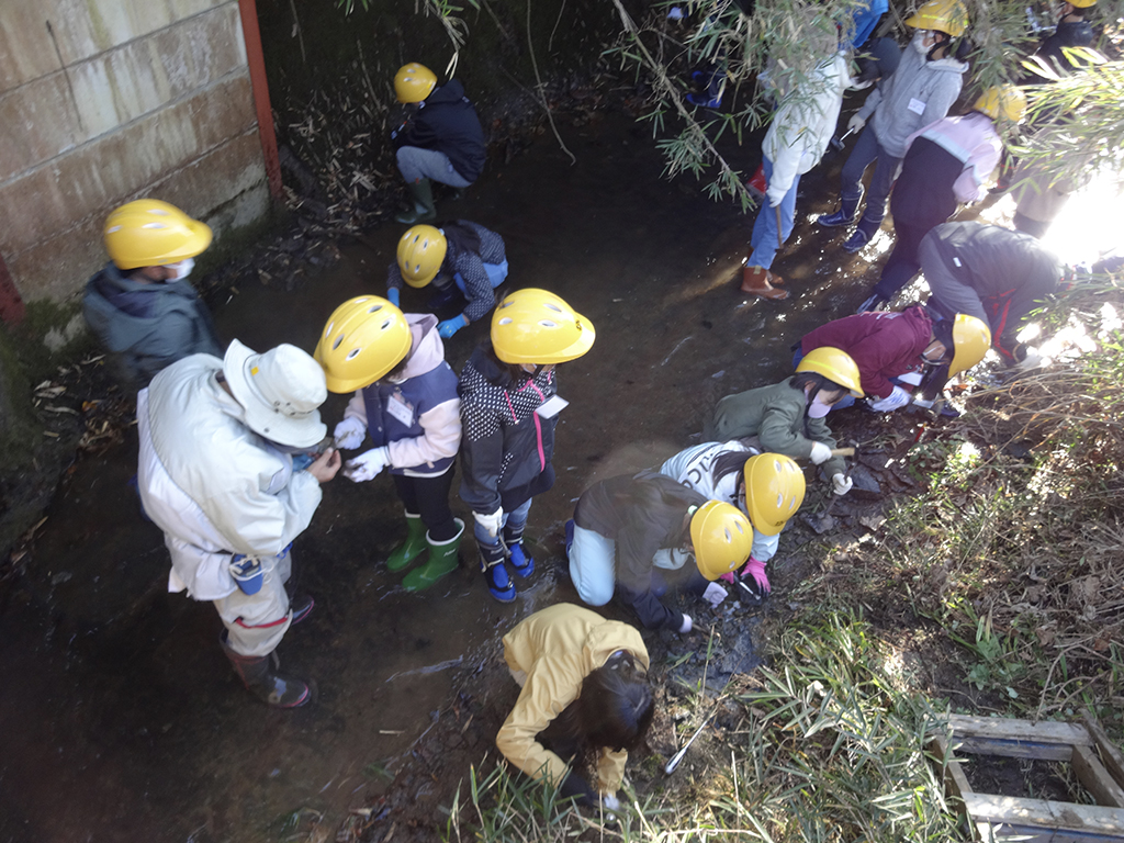 などについての講義を受けました。その後小川に入り川床で石を割って採集した貝の化石の名前や特徴を講師から聞き、ある環境にしか生育できない生物や地層が堆積した当時の環境