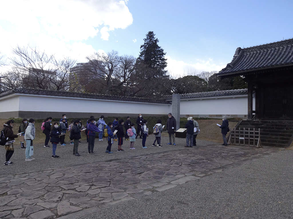 などについて説明があり、子どもたちからの質問等がありました。その後、弘道館に入り展示室で説明を受け、外に出て公園内の八掛堂、孔子廊や種梅記などを見学しました。休憩後、子どもたちは、大手門や薬医門など水戸城の特徴や当時の様子などについての説明を真剣に聞き入っていました。