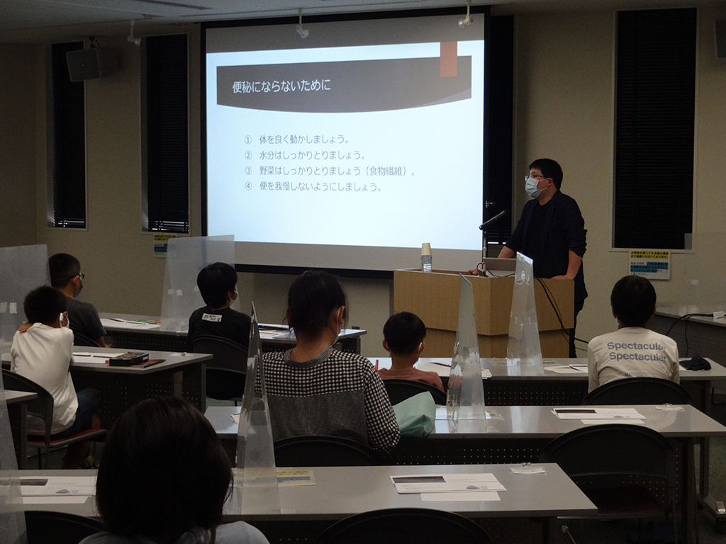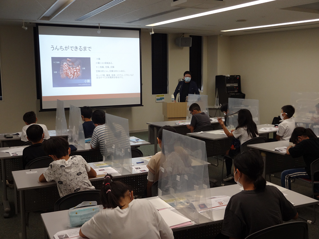 について説明があり、子どもたちからの質問等がありました。また、参加された保護者からの質問もあり、先生からも「腸の中は体の中ですか?外ですか?」と質問があってうんちから人の健康を見分けることが出来るなどについての説明を真剣に聞き入っていた。